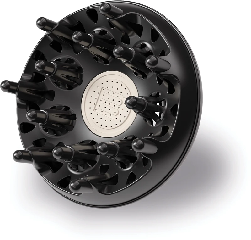 Pour atteindre un volume plus important, réglez le sèche-cheveux sur la vitesse et la température minimales. Positionnez le diffuseur directement sur les cheveux et faites des mouvements du bas vers le haut, comme si vous vous massiez le cuir chevelu.